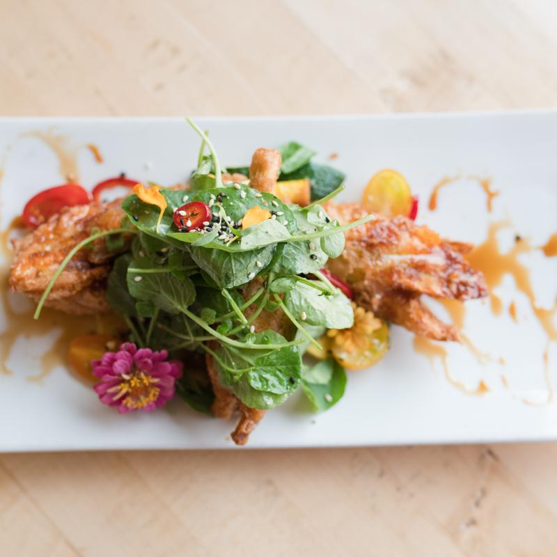 The restaurant offers a homey ambiance, enhanced by an award-winning cocktail menu, including the Holy Roller, winner of the Salt Lake Magazine Cocktail contest. The menu features fresh, daily flown-in fish and Wagyu beef from Kuro Wagyu in Colorado. A garden on-site supplies primarily fresh herbs, peppers, heirloom tomatoes, and squash blossoms, contributing to the farm-to-table experience.