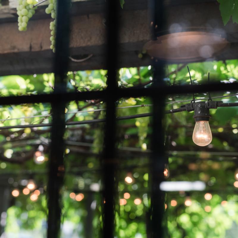 Guests can enjoy their meals under a grapevine-covered patio, planted in 1981, adding to the delightful summer dining experience.